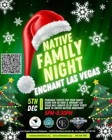 Enchant Christmas Native Family Night Join us for Native Family Night on December 5th at the Las Vegas Aviators Ballpark as United Natives partners with Enchant Christmas and the Las Vegas Indian Center to bring holiday magic to our community. Experience the World’s Largest Christmas Light Maze, festive activities, and a joyful night designed to celebrate and uplift Native families. Every ticket purchased supports our nonprofit programs, helping us spread warmth, visibility, and holiday cheer throughout Indian Country.